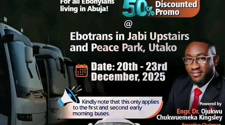 The Executive Chairman, Britking Group Limited, Engr. Dr. Ojukwu Chukwuemeka Kingsley has announced a 50% discount for all Ebonyians who would be travelling from Abuja to the state for the 2025 festive season. The Christmas travel discount; “Ebonyi Christmas Travel…