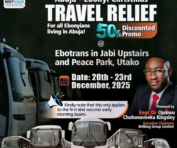 The Executive Chairman, Britking Group Limited, Engr. Dr. Ojukwu Chukwuemeka Kingsley has announced a 50% discount for all Ebonyians who would be travelling from Abuja to the state for the 2025 festive season.