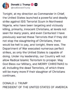 Tonight, at my direction as Commander in Chief, the United States launched a powerful and deadly strike against ISIS Terrorist Scum in Northwest Nigeria, who have been targeting and viciously killing, primarily, innocent Christians, at levels not seen for many years, and even Centuries!