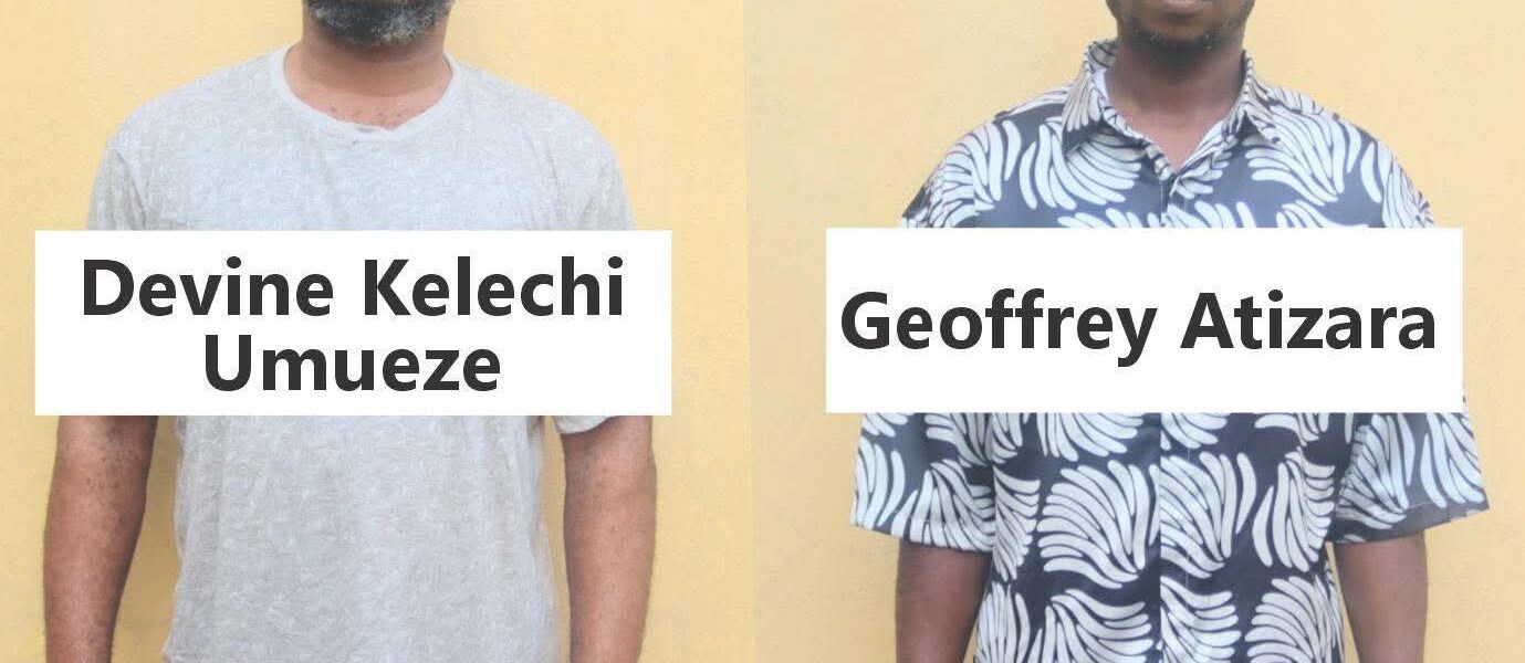 The men, identified as Geoffrey Atizara, 38, from Aleibiri in Ekeremor Local Government Area of Bayelsa State, and Divine Kelechi Unueze, 42, from Nekede in Owerri, Imo State, were nabbed at a hotel on Tenacious Street in the Edepie area of Yenagoa, according to security sources.