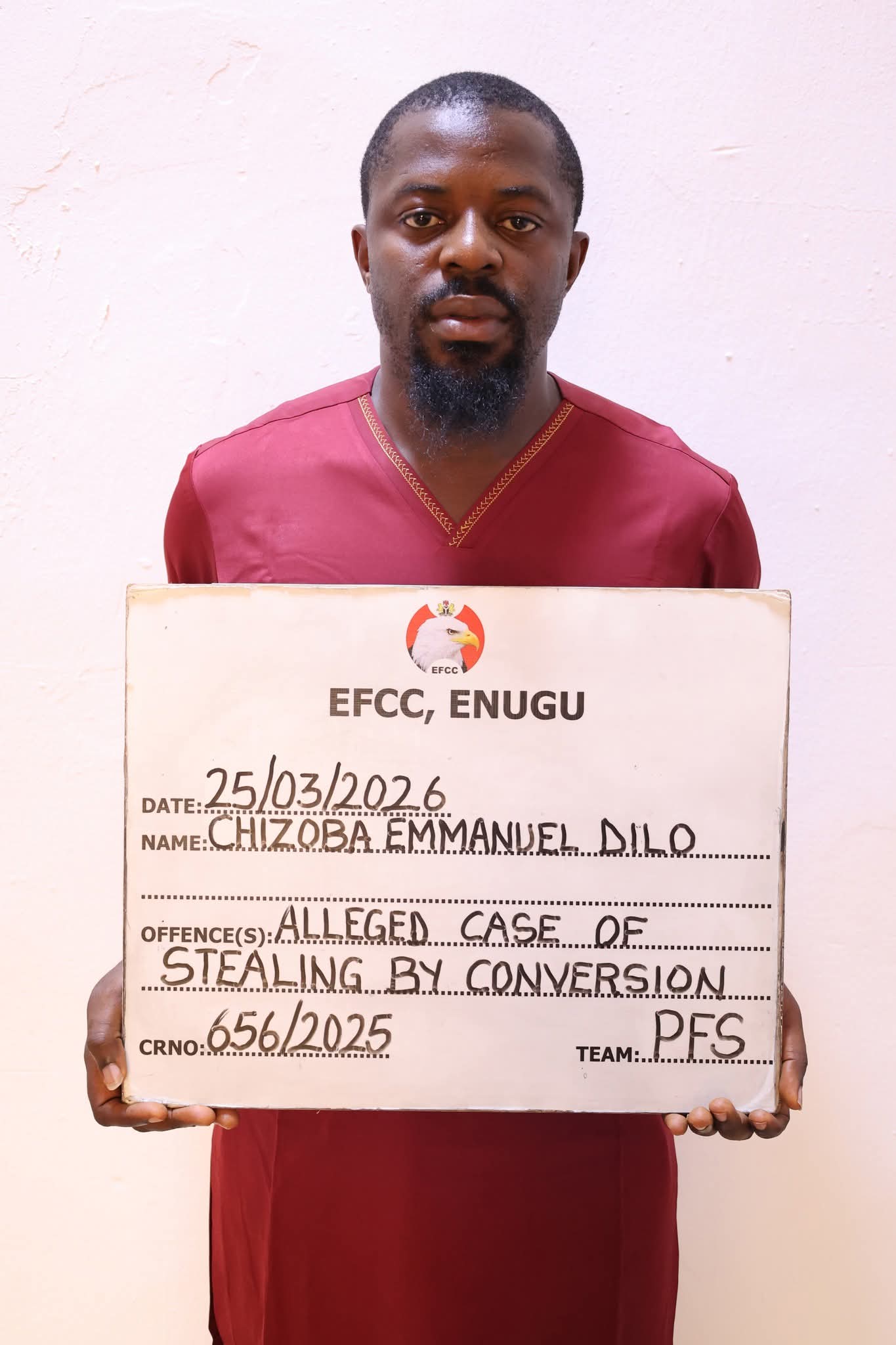 The Enugu Zonal Directorate of the Economic and Financial Crimes Commission, EFCC has arraigned a 29-year old businessman, Chizoba Emmanuel Dilo, before Justice S. N. Odili of the Enugu State High Court sitting in Onitsha, Anambra State over an alleged case of stealing to the tune of N64, 000, 000. 00 (Sixty-four million Naira).