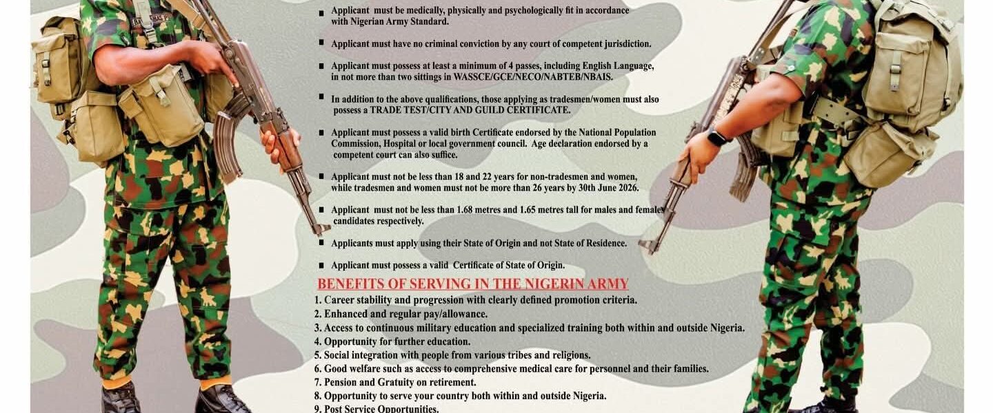 On eligibility, the Army noted that applicants must “be Nigerian citizens by birth. For non-tradesmen/women, age is between 18 and 22 years, while age for tradesmen/women is between 17 and 25 years.”